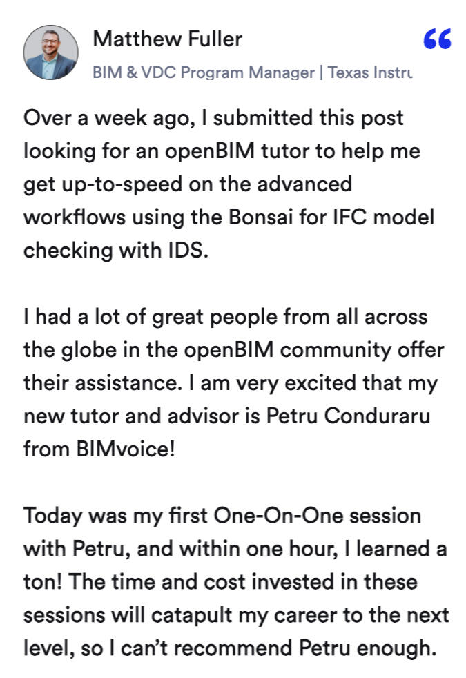 BIMvoice Academy is my free learning community for BIM professionals.It includes shared resources, discussions, live sessions, and the 7 Day OpenBIM Challenge. It is a place to learn, ask questions, and stay connected to practical OpenBIM topics.